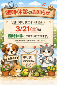 3/21(土)は、スタッフの学会参加の為、終日休診となります。ご迷惑をおかけしますが何卒ご理解の程宜しくお願い致します。