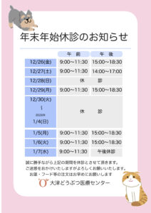 なお、年末年始にはフード、薬剤メーカーもお休みとなります。
